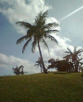 | 2/4(金) | 日本から3時間半でグアム空港へ到着。1時間時差があるので現地時間は午前2時半。 ↑のような薄手のニットを着ていたのに思ったより蒸し暑くない! まあ深夜だしね。 最低気温は22度くらいということだけど空気もカラッとして心地いい☆ 荷物の受け取りや携帯電話のレンタル、説明などもありホテルへ着いたのは午前3時半過ぎ。 それから荷物の整理や明日の準備、かわりばんこにお風呂に入ったりなどしていたら あっという間に5時近くになってしまった。慌てて就寝。 今日は島内観光! ロビーに9時集合のため7時半に起きて準備。 妹は初めて。私は2度目のグアム。 実は、大学の卒業旅行で訪れたときは日に当たりすぎて大やけどを負ったのです。 (日本に帰国してすぐそれぞれが皮膚科にむかい、思い出しても恐ろしい程水ぶくれや腫れが!) それは一日ビーチにいたからですが、油断してはいけません。 グアムの日差しはなんと日本の6倍!! 日焼けどめを塗っていても日焼けしちゃうくらいです。 そこでせっせせっせと日焼け止めを塗って出かけました。 ![]() まずは有名な恋人岬 [Two Lovers Point]。 前回来た時は工事中で見られなかったので楽しみにしていました。 〜 その昔スペインの植民地だったグアム。 スペイン人船長が現地のチャモロ人の娘と結婚したがったが、娘には恋人が。 追い詰められた2人は互いの長い髪を結び身を投じたという 〜 悲恋伝説にまつわる場所で、海抜120mもあります。 崖の上にせり出した展望台から下をのぞくとすごい迫力! 切ない伝説ですがとても綺麗な景色。。。 美しい景色に囲まれ安らかに眠っているのでしょうね。 ![]() この鐘の奥に、ここに観光に来た恋人たちのネームプレートが 打ち付けられた石盤がありました。 なんてロマンチック!と思ったら、台風で倒れていました…。 グアムは台風の通り道で、椰子の木や建物なども被害を受けるそうです。 高さ2メートルくらいのずいぶんどっしりした石盤なのに 自然の力はすごい。 ちなみに今日も恋人岬付近は風が強くて手すりにしがみつきながら 観光していました。 ![]() 展望台から離れて高台をお散歩。 薄曇で空や海の色が淡のが残念だけど、 とても広々していて 風に吹かれていると心の中のもやもやまでサーッと飛ばされていくみたい。 あーなんて気持ちがいいんだろー。 ![]() アプガン砦[Fort Apugan]。 1800年頃に建てられたスペイン軍の砦跡。 チャモロ族の襲撃に備えて造られたものだそう。 この大砲はスペイン王国の紋章が刻まれたレプリカ。 今では市街地や海を見渡せるビューポイントになっています。 戦争を忘れちゃいけない教訓の場所だけど 人々が集う平和な場所になっているんですね。 ![]() ![]() 今度はスペイン広場[Plaza de Espana]。 1763年〜1898年に総督邸があった場所に造られたそうで、 緑の芝生にグアムの花ブーゲンビレアが美しい広大な場所。 総督邸は門や土台が残る程度ですがレトロで趣がありました。 右の写真は敷地内にある「チョコレートハウス」。 総督婦人がスペインの習慣にちなんで チョコレートドリンクでお客様をもてなしたんですって! 六角形の形の建物でなんともかわいいですね。 グアムの観光地でよく見かけたのがこの椰子の実の露店! 椰子のジュースは薄ーいスポーツドリンクのようなさっぱりした味。 それよりも、とにかく2人で感激したのが椰子の実! ジュースを飲んだ後にスパン!と割って中身をはがしてもらい、 日本人好みのワサビ醤油でいただくんですが、 何ともいえないぷにっとした歯ごたえと、アボガドに似た甘みのある味。 おいしーい!! 朝食を食べていなかったこともあるかもしれませんが(笑) 妹はこの旅で一番おいしかったのでは?! なんて大げさな話までしていました。 びっくりしました。予想外の味っ。