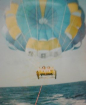 | 2/6(日) | 今日は午前8時集合で「パラセイリング&バナナボート」!65$ 2人だと準備に時間がかかるので5時50分には起床。 今日もしっかり日焼け止め。 ![]() 船の上で格闘技?!テコンドー?? 違いまーす! バナナボートに乗って安全に楽しむためには このクッションの効いたヘルメットと 救命胴着が必要なんですから! ちょっと!笑わないでくださいよっ。 でもでも…自分でもおかしすぎます(笑)! そうかー。あんなに楽しかったけど 格好も楽しかったんだー。 バナナ型のゴムボートに乗って小型船に勢い良くひっぱられましたー。 「サメノエサ!サメノエサ!」と笑顔で言われつつ キャー!ワー!ギャー!ひゃっほーい!!と波をかぶって遊びました。 ゆっくりだと乗馬みたい スピードがあるとジェットコースターみたい とにかく面白かったー。 ![]() 次はメインのパラセイリング! 実は妹が船酔いをしてしまい、 心配で空の旅を楽しむどころではなかったんですが ぐんぐん空にむかって上がる感じと まわりには海と空しかなくてぽつんと浮かんでいる感じに じーん…と感動しました。 あたりはとてもとても静かで風も緩やかでした。