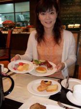 彫刻のように飾り切りした新鮮なサラダ、和食…好きなだけ取り分けていただく。
