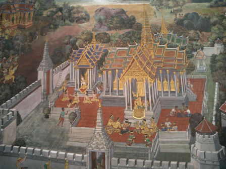 エメラルド寺院全体を取り囲む回廊。インドの叙事詩「ラーマーヤナ」のタイ語版「ラーマキエン」を題材とした壁画が色鮮やかに。